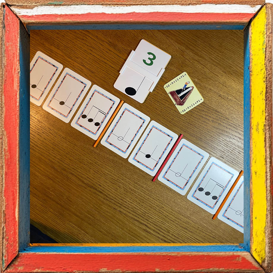 The game consists of 110 playing cards and some bar lines. On the playing cards there are different rhythmic units such as single quarter notes, half notes, quavers or rhythmic groups of several notes.